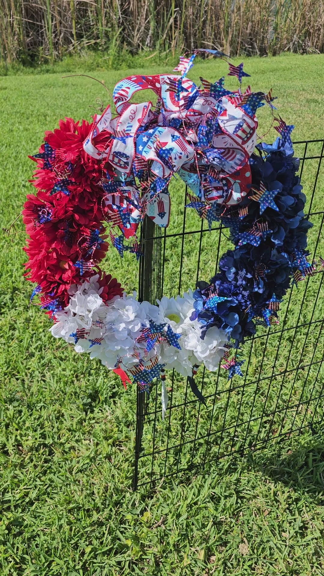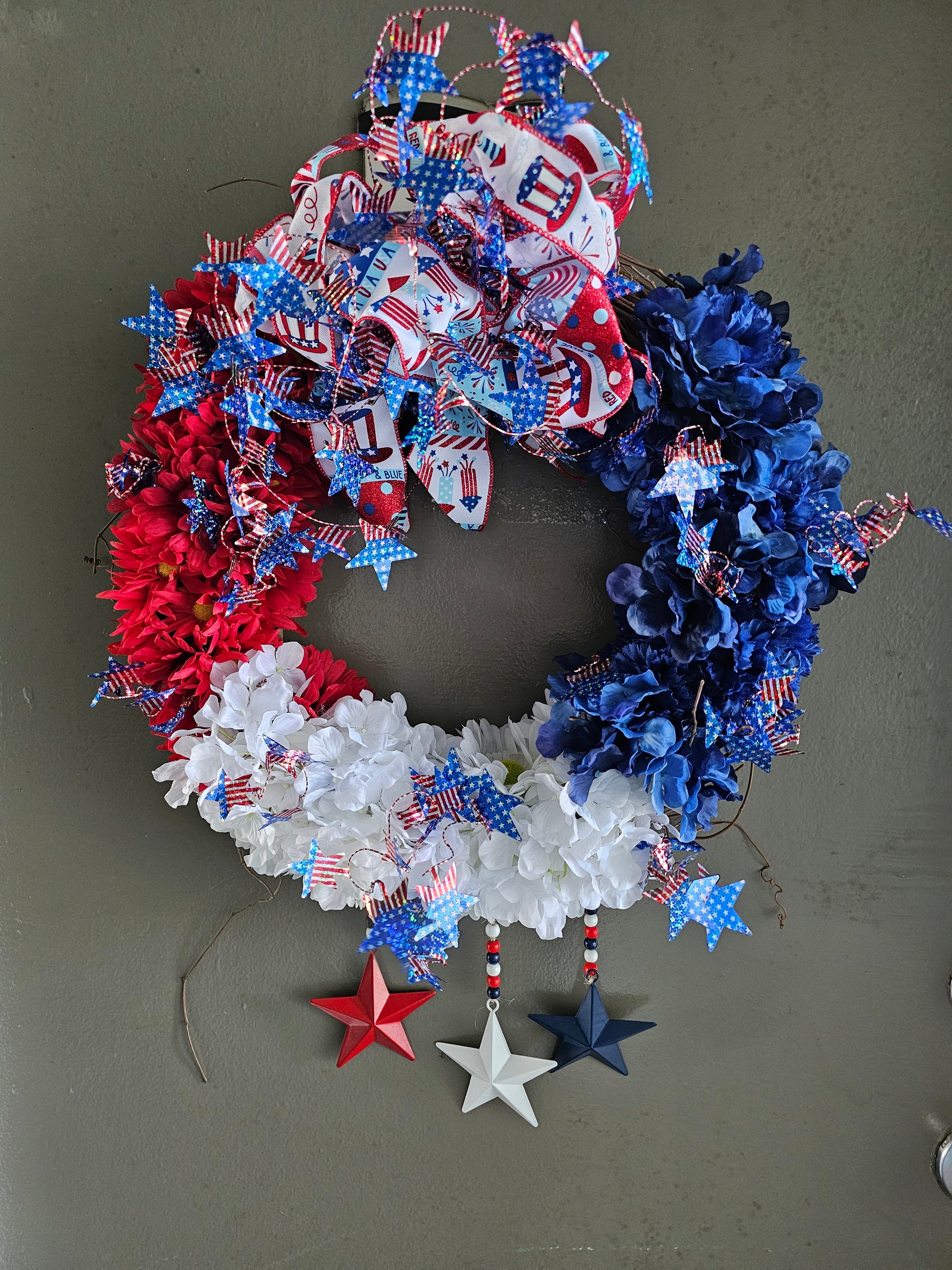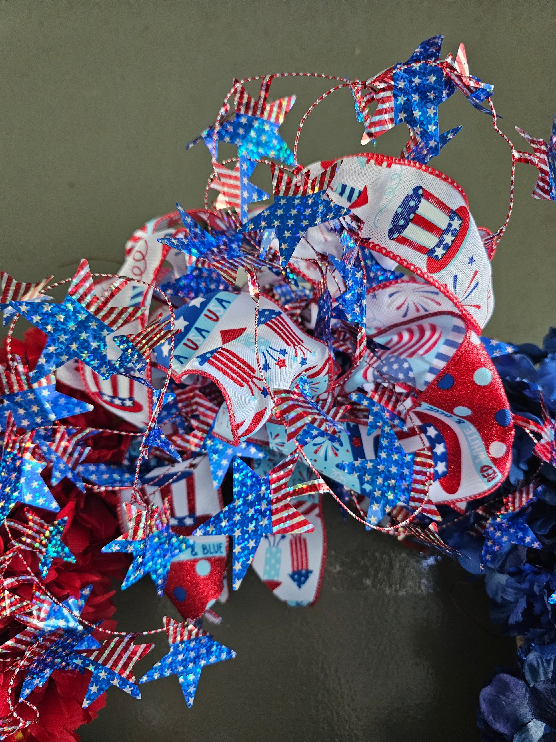 Handmade made to order red white and blue patriotic wreath with stars, flowers, and festive ribbon, perfect for 4th of July or Memorial Day decor from RebelWinks.com